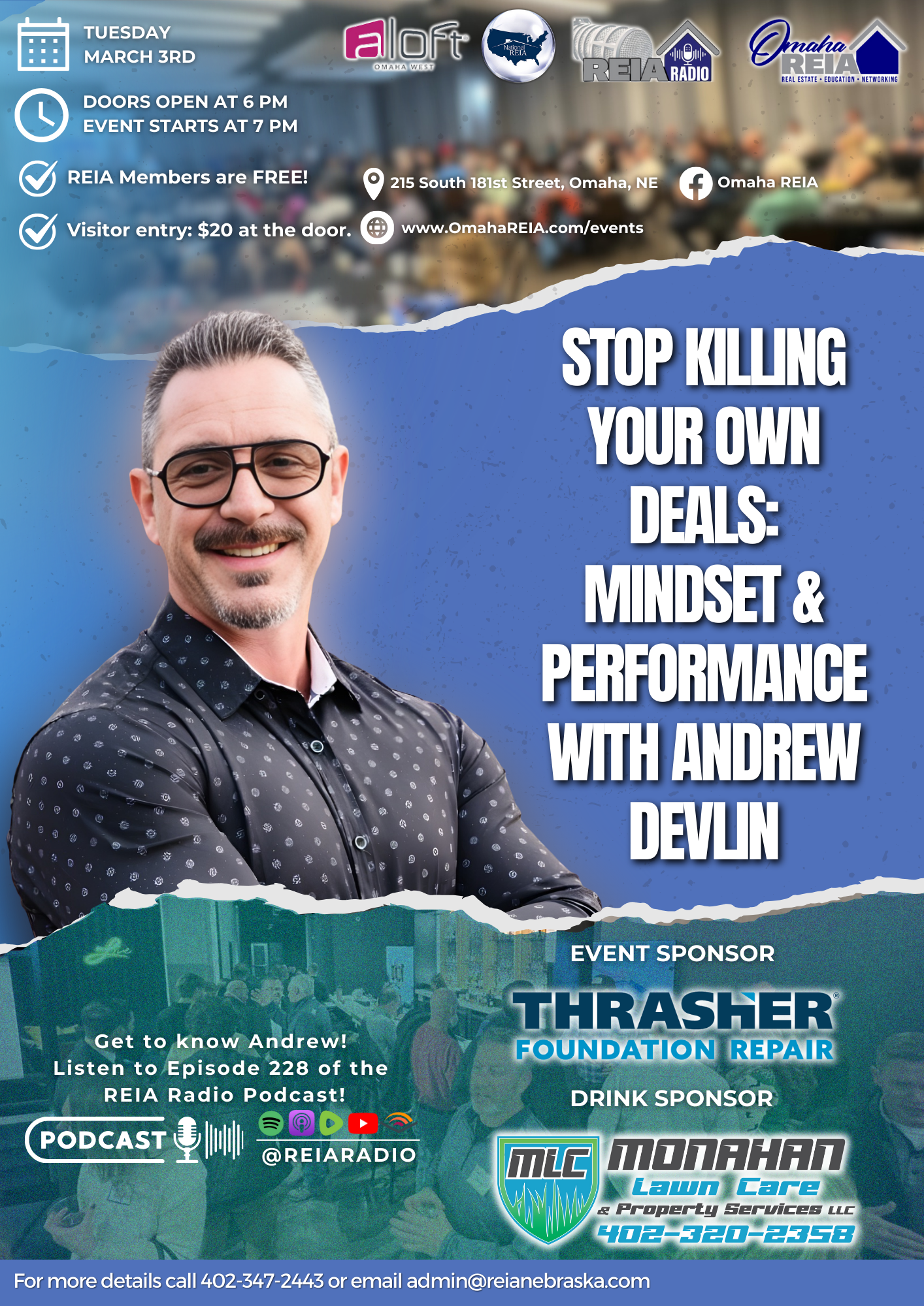 At this Omaha REIA event, mindset and performance coach Andrew Devlin is going to break down why investors and agents repeatedly get in their own way—and how to stop doing it. He’ll dig into the patterns that quietly wreck progress: fear of failure, fear of success, perfectionism, and the “I’ll start Monday” habit that never ends.