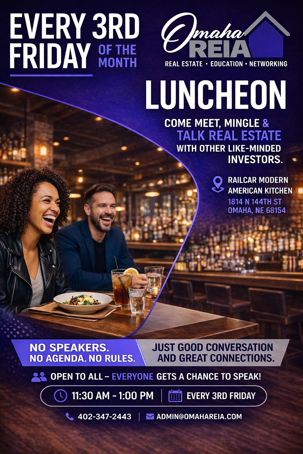 Join us for a laid-back networking lunch with Omaha’s real estate community—investors, agents, lenders, and local pros. This isn’t a presentation or a formal meeting. It’s simply a chance to grab lunch, meet great people, share ideas, and build relationships that can turn into real opportunities.