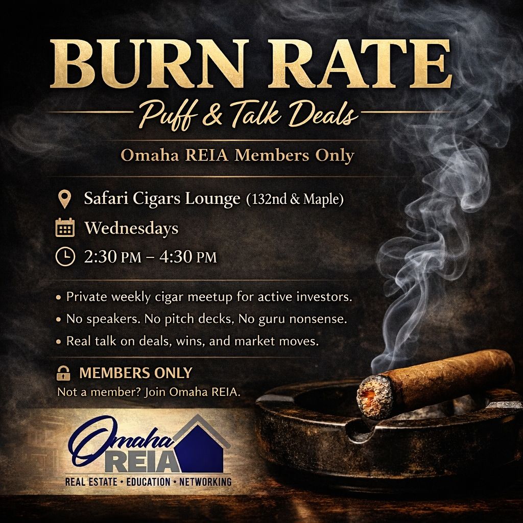 Burn Rate: Puff & Talk Deals is a private weekly meetup created for Omaha REIA members who want real conversations with other active investors in a laid-back setting. This is not a speaker event, a sales pitch, or one of those weird “let me tell you how rich I am” rooms. It’s a place to connect, talk deals, share wins, work through challenges, and stay sharp on what’s happening in the market.