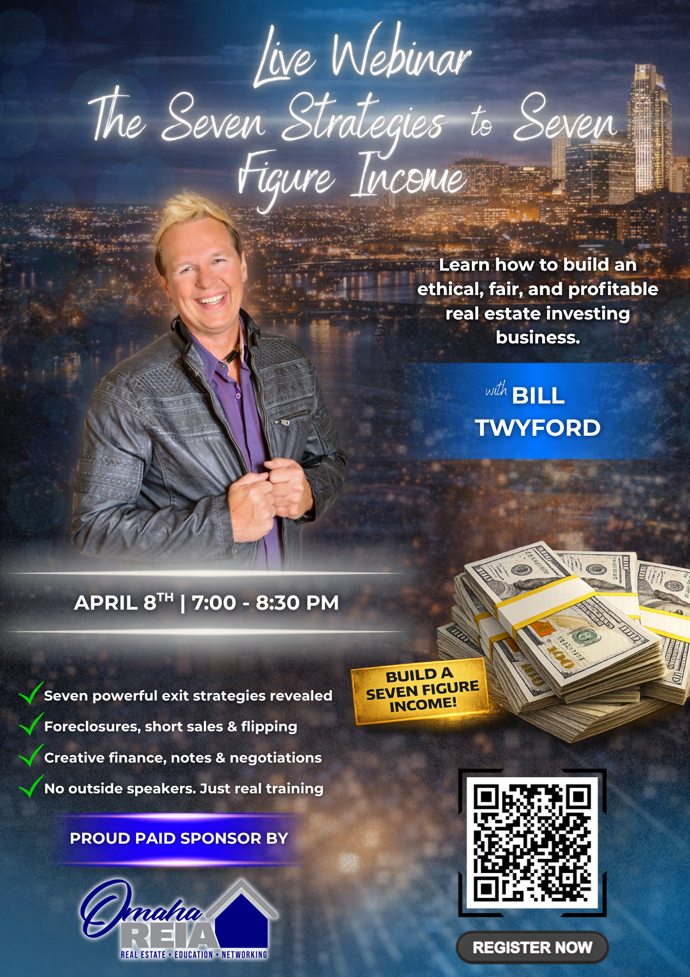 Join us live on April 8th from 7:00 PM to 8:30 PM for a special webinar with Bill Twyford as we lead into the upcoming Seven Secrets to Seven Figure Foreclosure Summit. Bill will be covering foreclosure strategies, short sales, flipping, creative finance, notes, and negotiations while sharing how to build a real estate business the right way. This is a great preview of the full live event on April 18th and 19th.