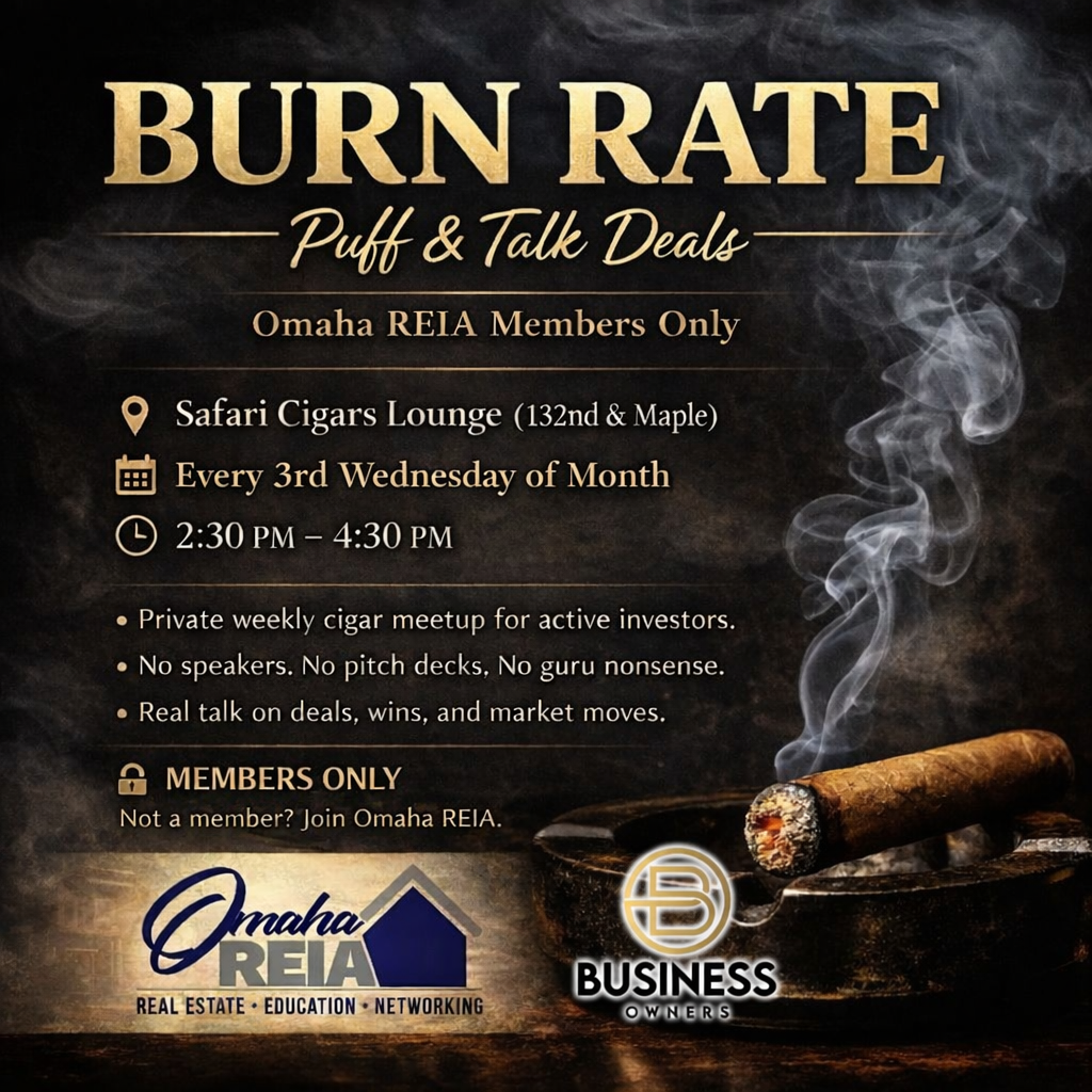 Burn Rate: Puff & Talk Deals is a private weekly meetup created for Omaha REIA members who want real conversations with other active investors in a laid-back setting. This is not a speaker event, a sales pitch, or one of those weird “let me tell you how rich I am” rooms. It’s a place to connect, talk deals, share wins, work through challenges, and stay sharp on what’s happening in the market.